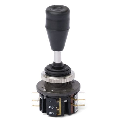Он имеет от 1 до 8 направлений срабатывания с комбинированным или пружинным возвратом. Предусмотрен один переключающий контакт с зажимным разъемом 2.8 x 0.5 IEC 760 для каждого направления срабатывания. В рукоятке имеется центральный позиционный выключатель и кнопка.