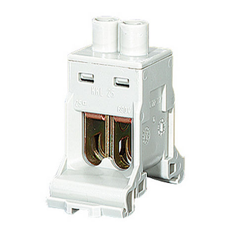 KKL 25 присоединительная клемма изготовленная Hensel. Оборудовано с 2 соединенными зажимая блоками, оно отличает расклассифицированной соединяясь емкостью колебаясь между 6 mm ² до 35 mm ² и настоящей пропускной способности A. 102. В добавлении, оно специфически создан для установки на рельсы DIN.