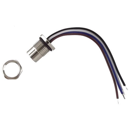 CONN-M8A-FRP80: 4-контактный разъем с внутренней резьбой. Это 4-контактный водонепроницаемый разъем M8 со степенью защиты IP67. Он совместим с кодом A. Этот разъем следует монтировать изнутри корпуса или панели.