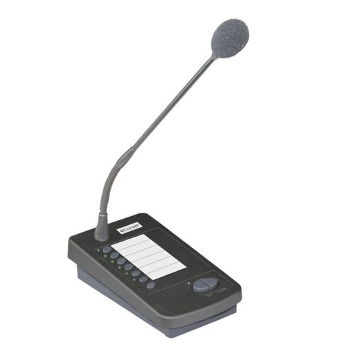 Предварительно усиленная станция с электретным блоком с микрофоном на гибкой ножке. 6 клавиш для выбора зоны (также могут быть настроены индивидуально как тревожные клавиши) и общего вызова, кнопка отпускания/удержания PTT+LOCK. Настройка уровня приоритета (до 7-го уровня) и регулировка чувствительности микрофона. Световой индикатор включения питания и занятости. Разъемы RJ45 для подключения к прямым кабелям CAT5 и SF-UTP.