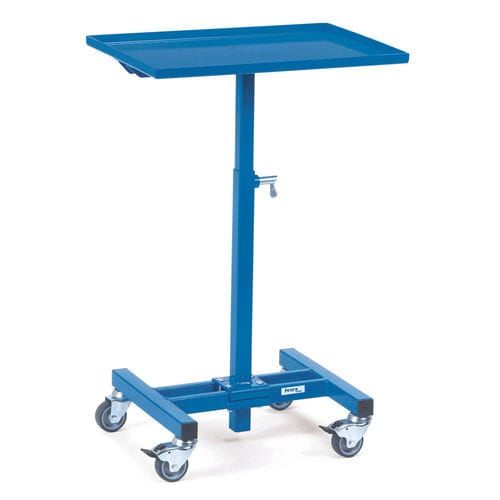 Для пластиковых коробок, коробок стальной пластины, корзин провода etc., регулируемых в высоте и черни. Секционная стальная трубчатая конструкция с платформой стальной пластины. Порошк-покрытое голубое RAL 5007. 4 рицинуса шарнирного соединения с покрышками TPE, эпицентрами деятельности с подшипником с цельной втулкой, 2 рицинусами шарнирного соединения с замками колеса. Платформа с полностью бортовой оправой, максимум стальной пластины 20 mm. Не inclinable, регулируемый в высоте в интервалах 25 mm.