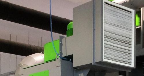 Неочищенный воздух поступает сначала в кабину, а затем в нижнюю часть корпуса, где скорость значительно падает. Из-за внезапного изменения скорости в контейнер попадают более тяжелые детали. Воздух окончательно очищается через картриджи и выходит через вентилятор.