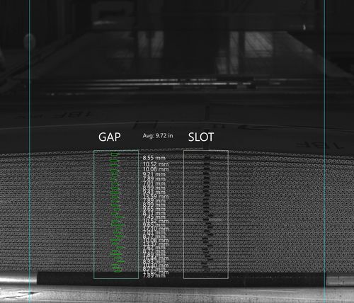 GapChek делает снимки лицевой и оборотной сторон каждой связки гофрированных коробок для измерения складывающихся зазоров в стыках производителя. Две камеры устанавливаются на конвейере после контрэжектора Flexo-Folder-Gluer. Обе камеры фиксируются по высоте и устанавливаются над самым высоким пакетом. Во время оформления заказа обе камеры позиционируются сервоприводами справа или слева, чтобы выровнять их с приблизительным расположением зазора в связке. Одна камера изображает заднюю сторону пакета, расположенную ниже по течению, чтобы измерить зазоры на задней кромке, в то время как другая камера изображает зазоры на передней кромке пакета, расположенной выше по течению, чтобы измерить зазоры на передней кромке. Пара фонарей рядом с каждой камерой освещают связки во время съемки.